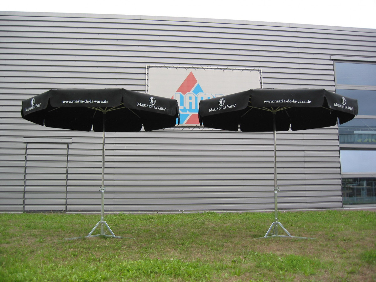 The pole and struts are made of aluminum. Spring shots are made of stainless steel, hot-dip galvanized coil spring. Joint parts made of glass fiber reinforced plastic. Protective corner made of PVC, leather roof cap with plastic protective cap. Tarpaulin made of syntetic, cotton, acrylic and PVCis available.It can be individually designed with a Print on the flounce and on the roofing.