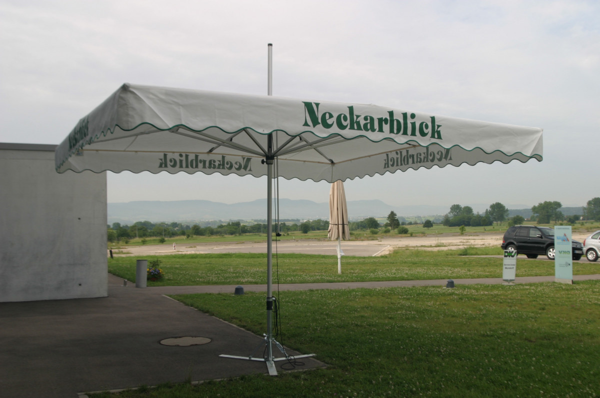 The RS-Großschirm is equipped with a rack made of 8 high-strength aluminum struts and a pole made of polished aluminum (diameter 50mm). To easily open and close the umbrella is also equipped with a telescopic device and cable pull. It is possible to quickly roof over a large area through the combination of multiple RS-Großschirme – ideal for every usage.