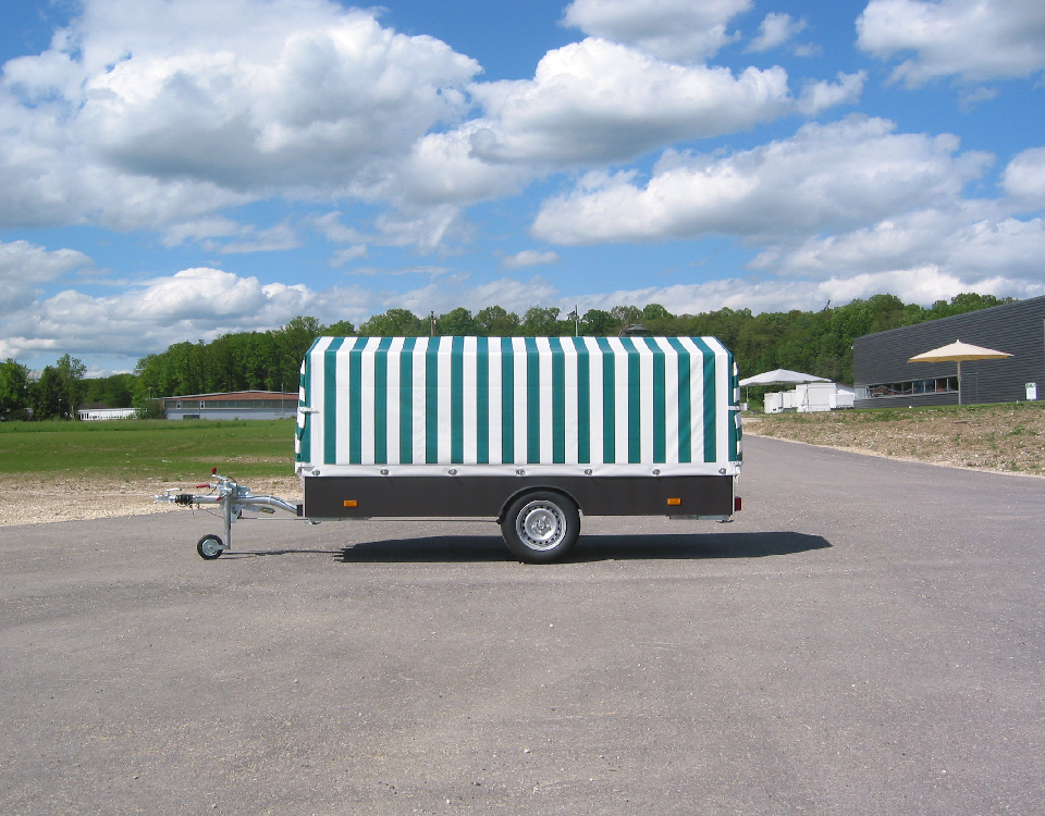 The trailer is closed in a way that the flounce and the insinde of the tarpaulin are protected from dirt. Type 200 trailers have mostly a simple construction and are . leight and agile. At the same time there is enough storage space for goods and accessoirs. Another advantage is that the complete range of umbrella-accessoires is compatible with the type 200.
