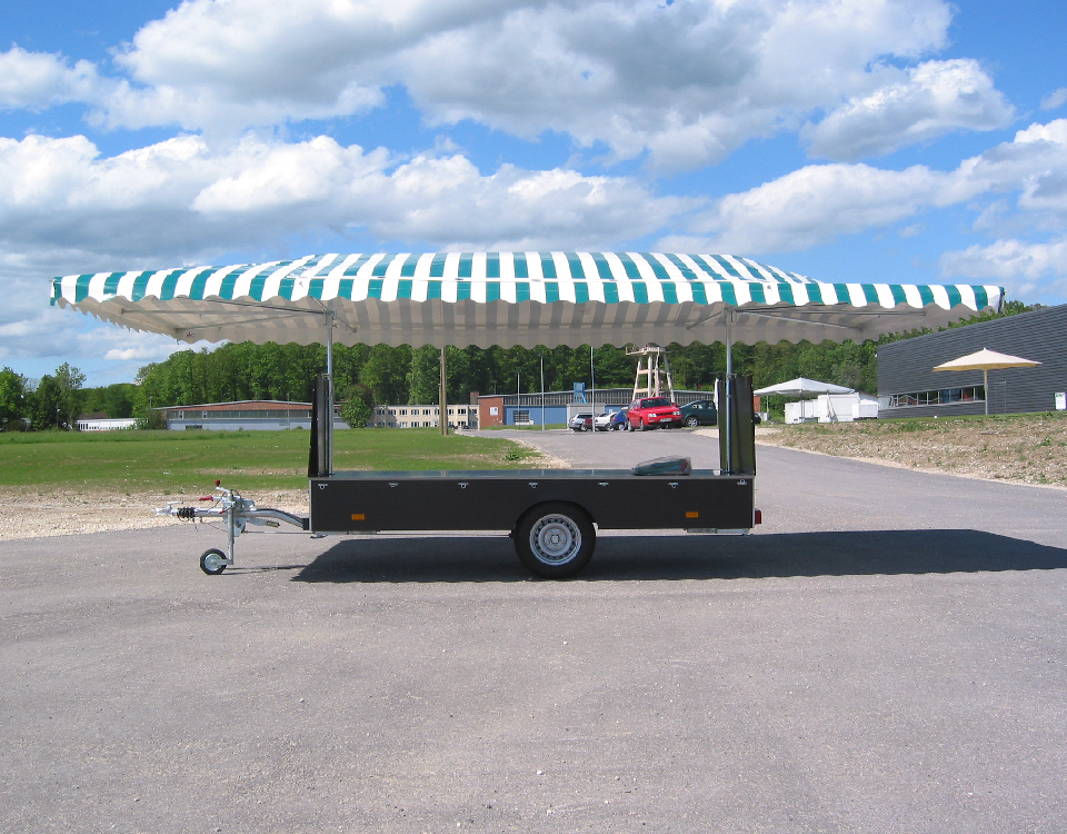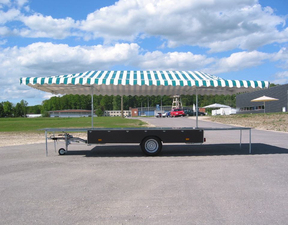 The trailer that you dont recognize as a trailer when it is set up. The tarpaulin of the type 200 is at the same time the umbrellaroofing – so there is just one tarpaulin for the trailer and for the roofing.