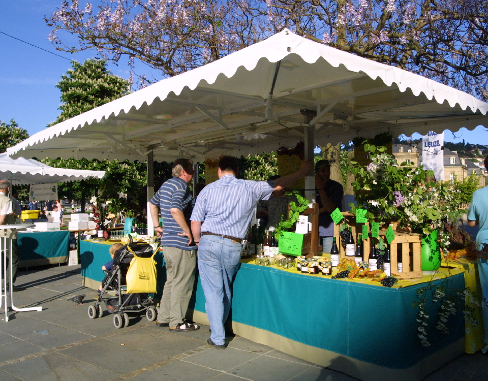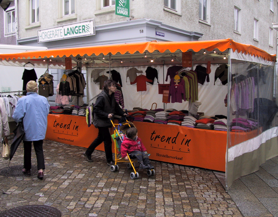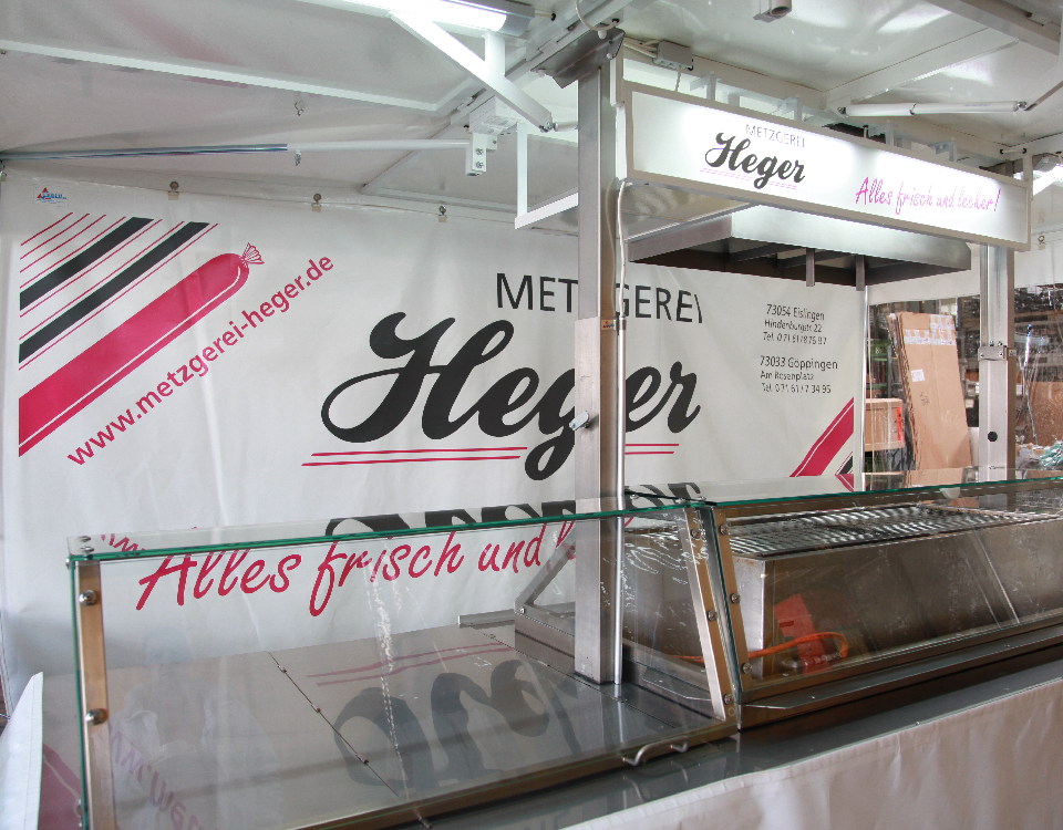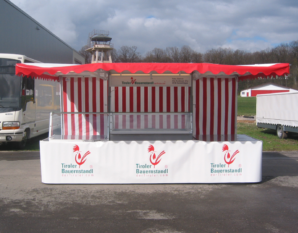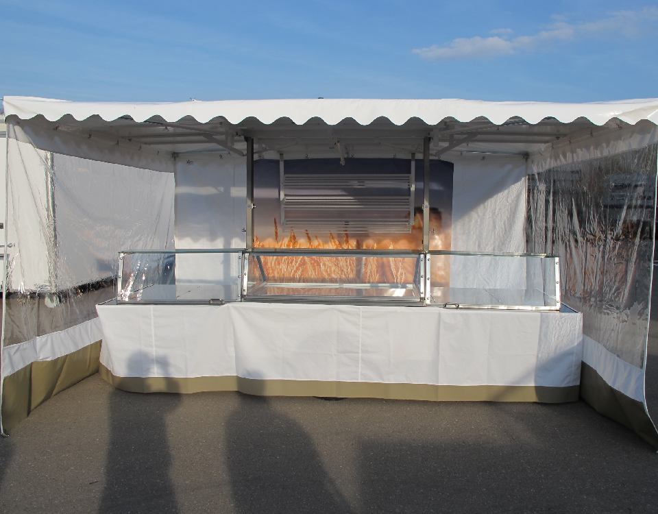 The type 300 is light and equipped with avariable lifting roof and is operated with a hand crank. It is completely set up in just a few minutes and can be equipped in various ways and is the classic on the market. If it is a breadshelf for bakery products, a cool counter for cheese and sausages, gradual cooling for olives and mediterranean specialities, a gas grill for steaks, bars for hangers or lockable drawers for jewellry. With this allrounder no boundaries are in sight.