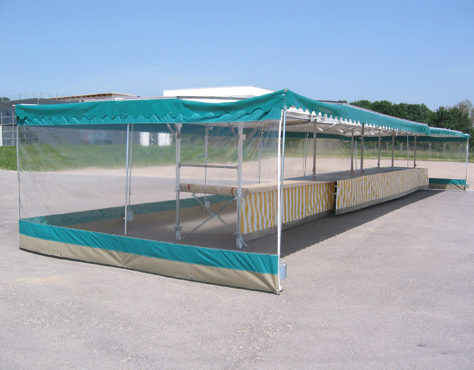 Proven for years in tough market conditions: The type 400/450 with fixed height (220cm) and extendable roof. The roof can be extended up to 6m depending on the chosen basic length of the trailer. The only difference between these two models are the pillars. The type 400 has the options of 4 or 6 pillars and the type 450 just has 2 pillars and is with that optional equippable with swingabe tables. Perfect for clear presentation of fruits, wegetables, flowers, mediterranian specialities and way more.