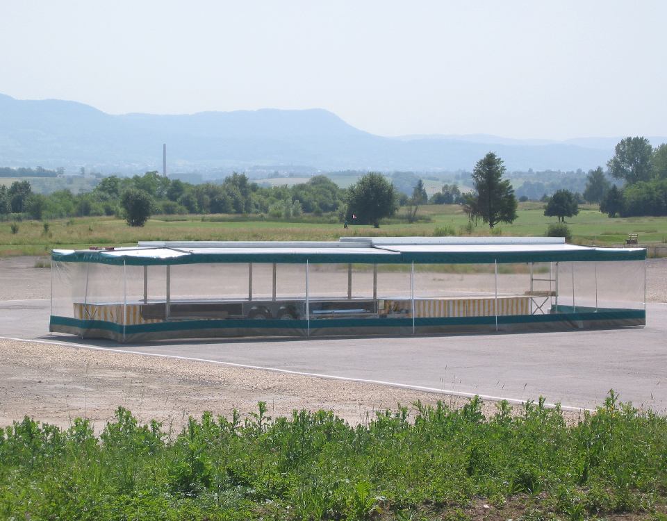 Operation: Unlock the hatches and open them. Pull the roof to the desired length. Insert external clamps in to the PVC corner. Open the tables and hang up the sidesheets as well as the cape sheets.