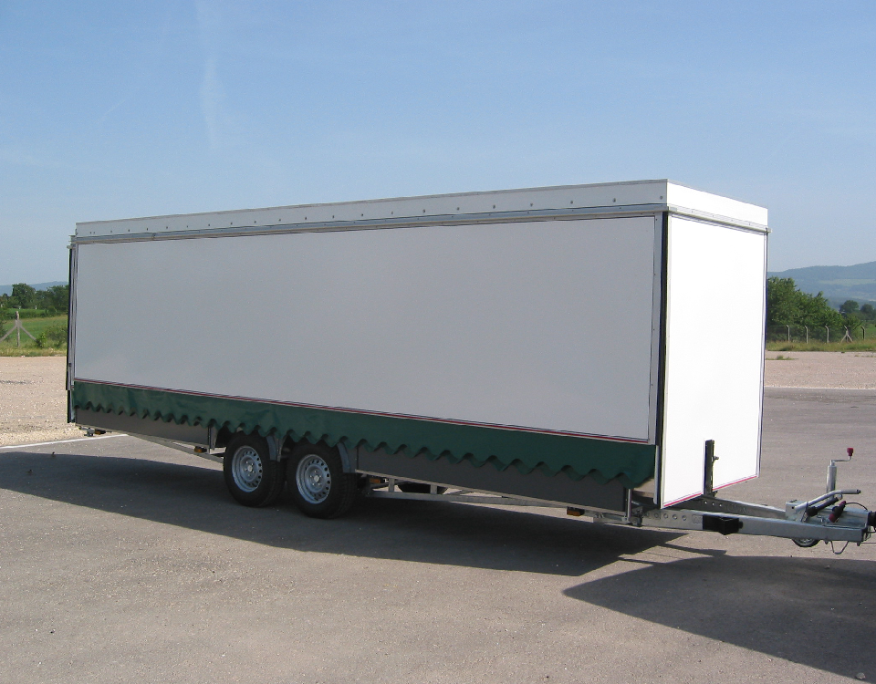 Material: Hot-dip galvanized vehicle frame. AL-KO axle. Aluminum sheet covering powder-coated. Tarpaulin made of PVC. Tabletops made of waterproof plywood. Stainless steel profile.