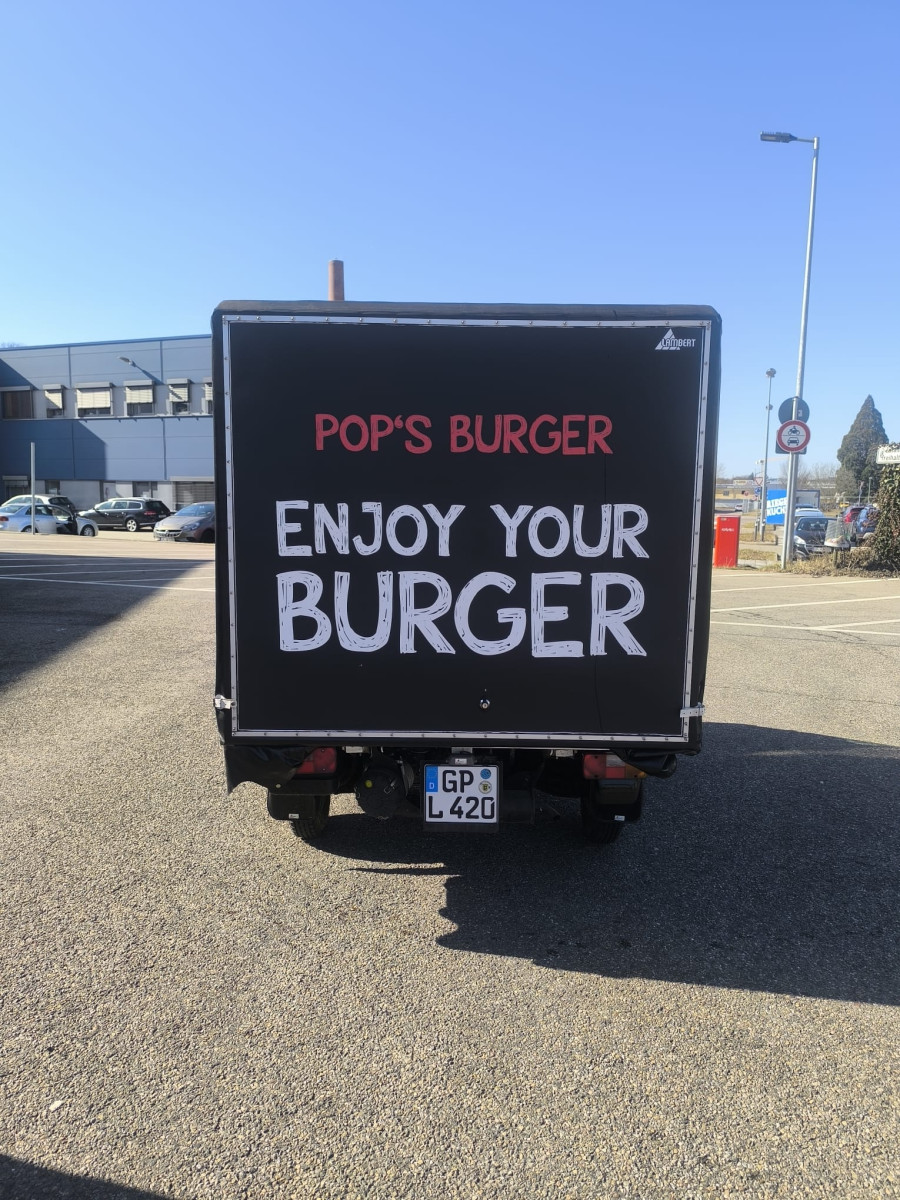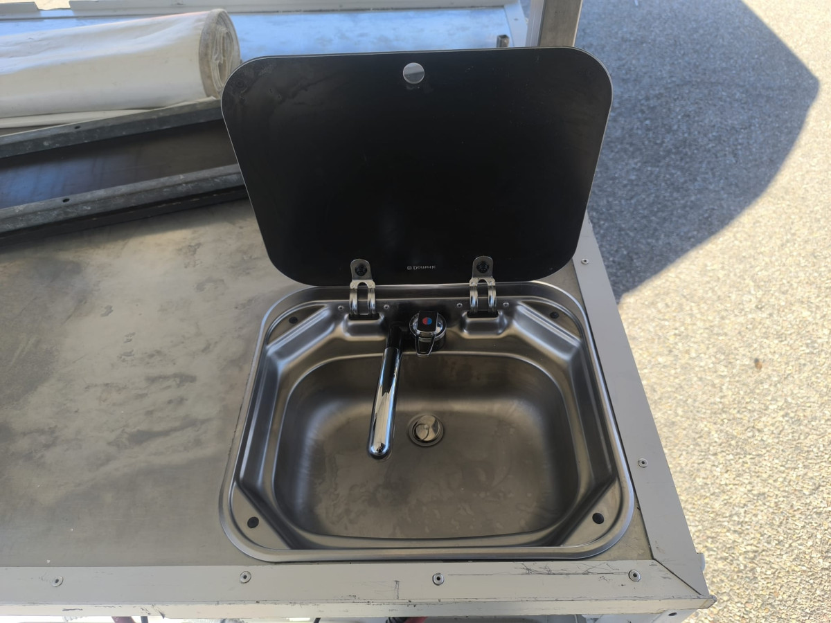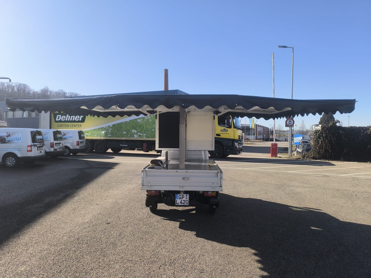 Ausstattung: - Dachplane in Farbe Schwarz, - Strom und LED Licht, - Waschbecken auf der Theke mit Glasablage, - Aufstelltheke mit weißer Schürze