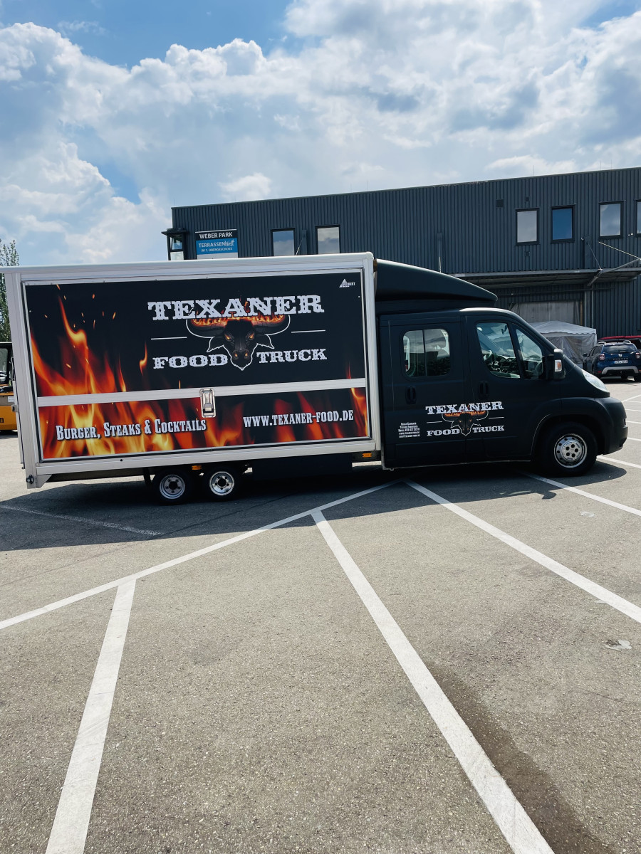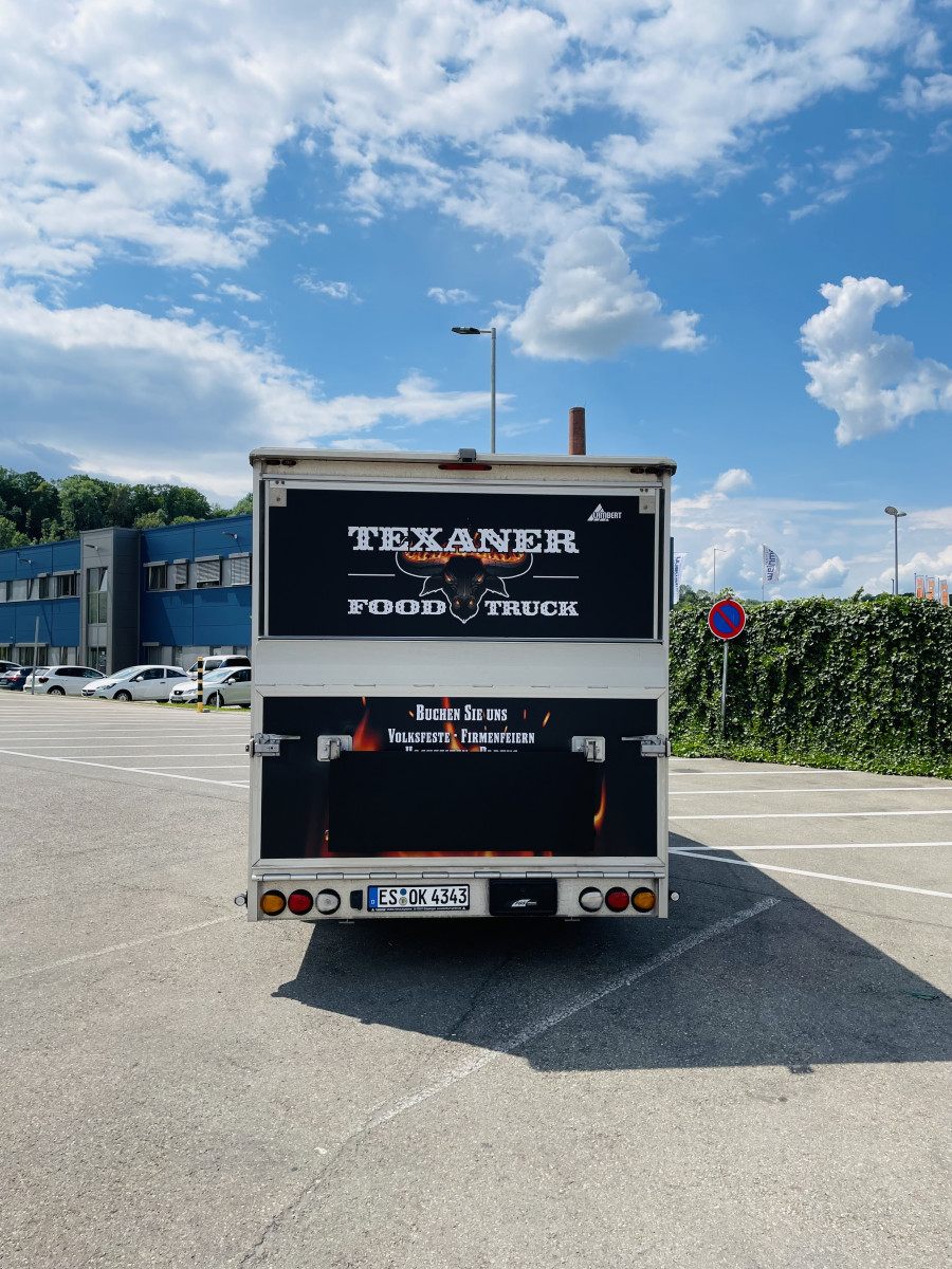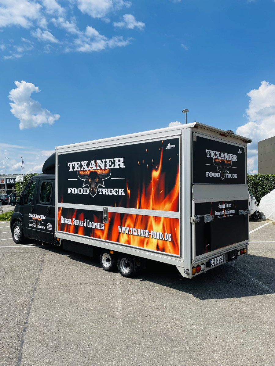 Fahrzeug ist Außen foliert mit "Texanerr Foodruck", die Werbung ist noch für die nächsten 10 Jahre patentiert und ist im Preis imbegriffen.