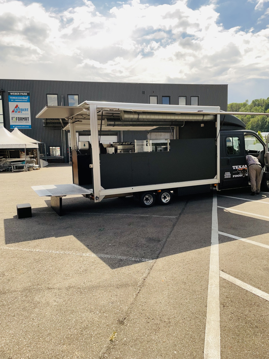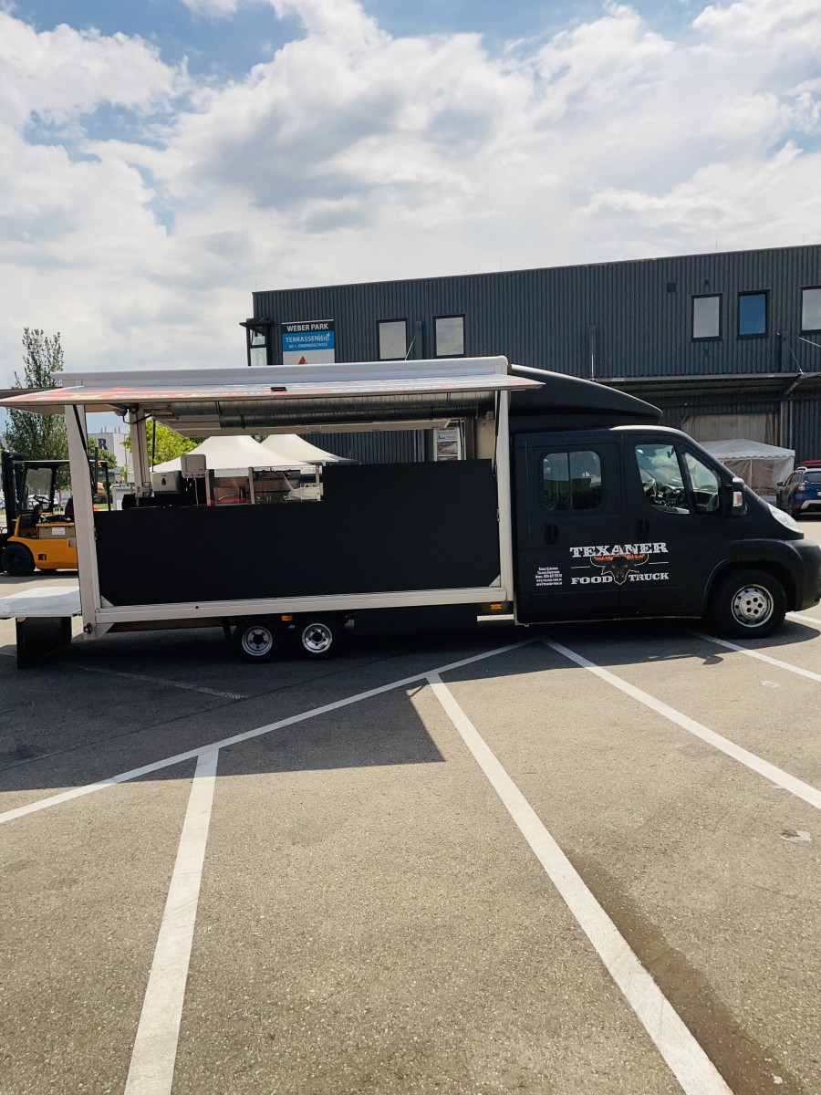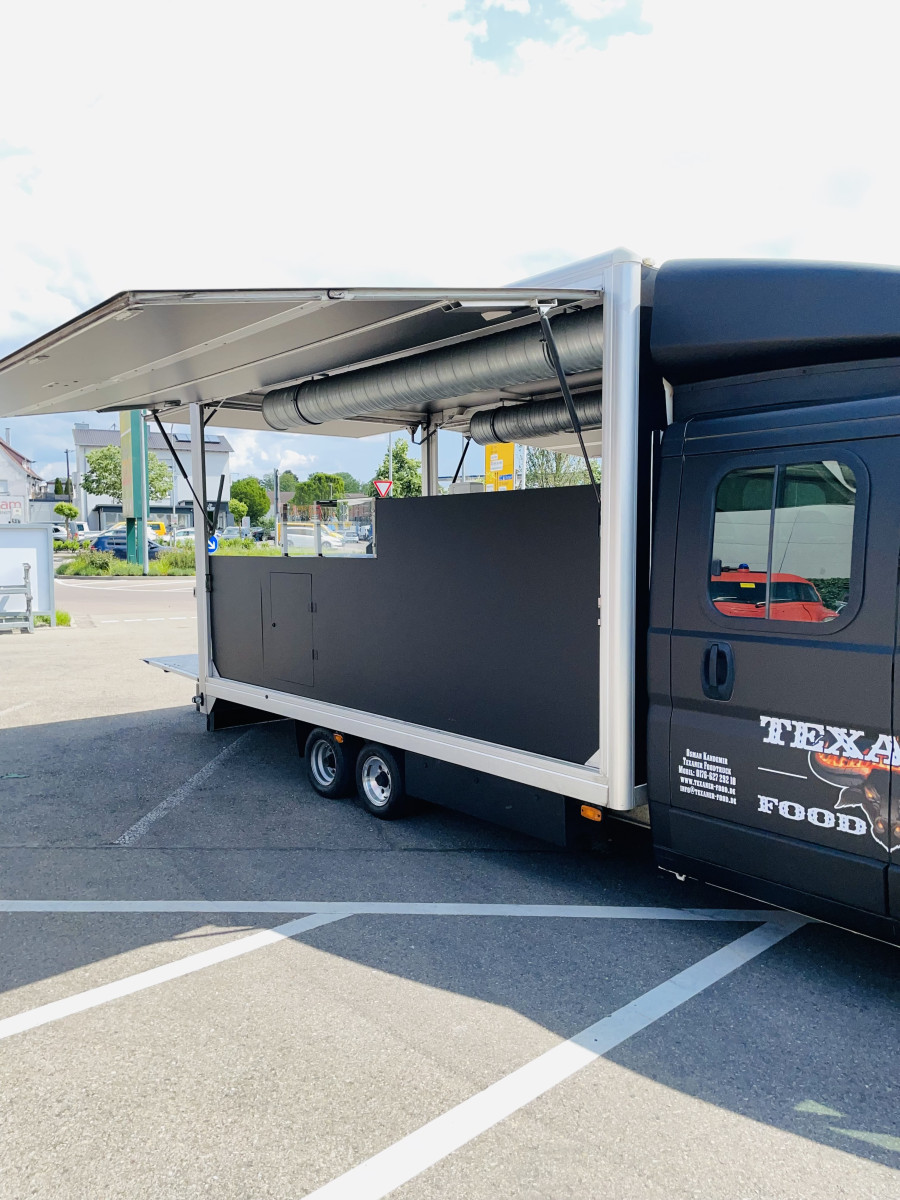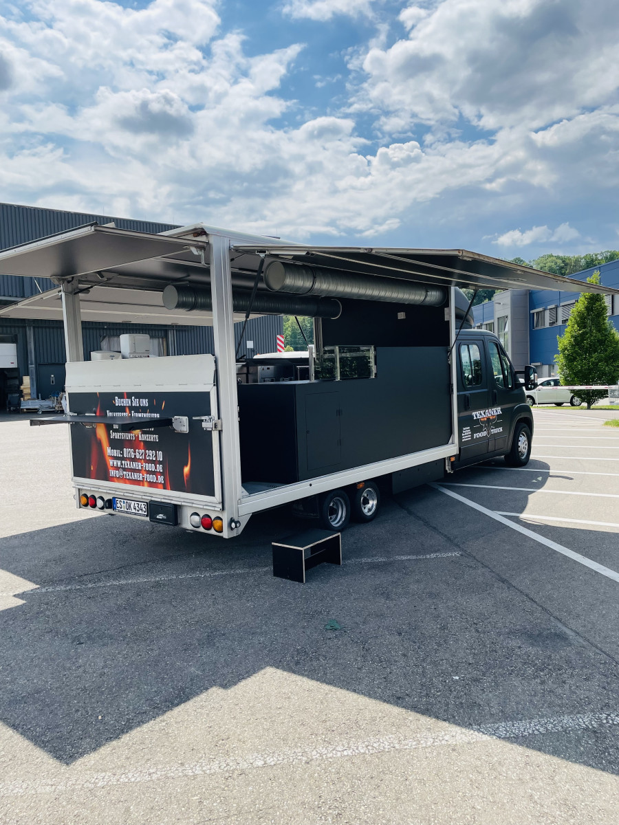 Ausstattung: - Rampe kann als Auffahrrampe oder als Verkaufsboden verwendet werden, - Verkaufsaufbau verfügt über 2 Verkaufsklappen, - Decke im Verkaufsaufbau mit schwarzen Alu-Verbundsplatten belegt, - Fußboden mit Anti-Rutsch-Gummimatte, - Stromanschluss, inkl. vielen Steckdosen und Lichtschalter, - Gaskasten mit Hochwertigen Gasleitungen, - Gasprüfbuch, - Dunstabzugszierrohr mit Motor an der Rückwand, - Zierrohr über der Ausgabetheke mit Einbaustrahlern, - Hygieneeinheit an der Rückwand, - Elektr. Friteuse 8 x 8 - 6,5kW, - Elektr. Pommeswärmer, - 2 Stück Gas Grillplatte- Glatt, - 2 Stück Kühltische mit Schubladen, Fahrzeug ist Außen foliert mit "Texanerr Foodruck", die Werbung ist noch für die nächsten 10 Jahre patentiert und ist im Preis imbegriffen.