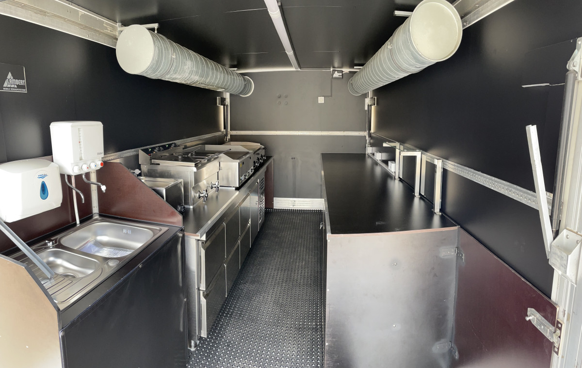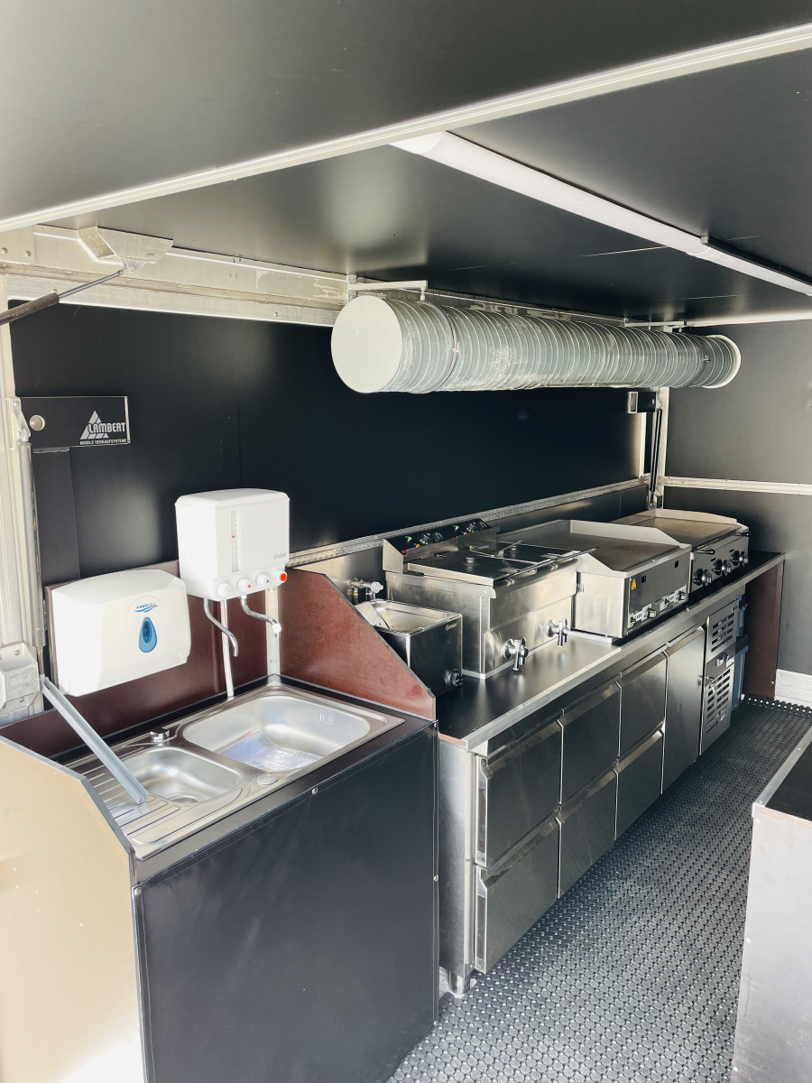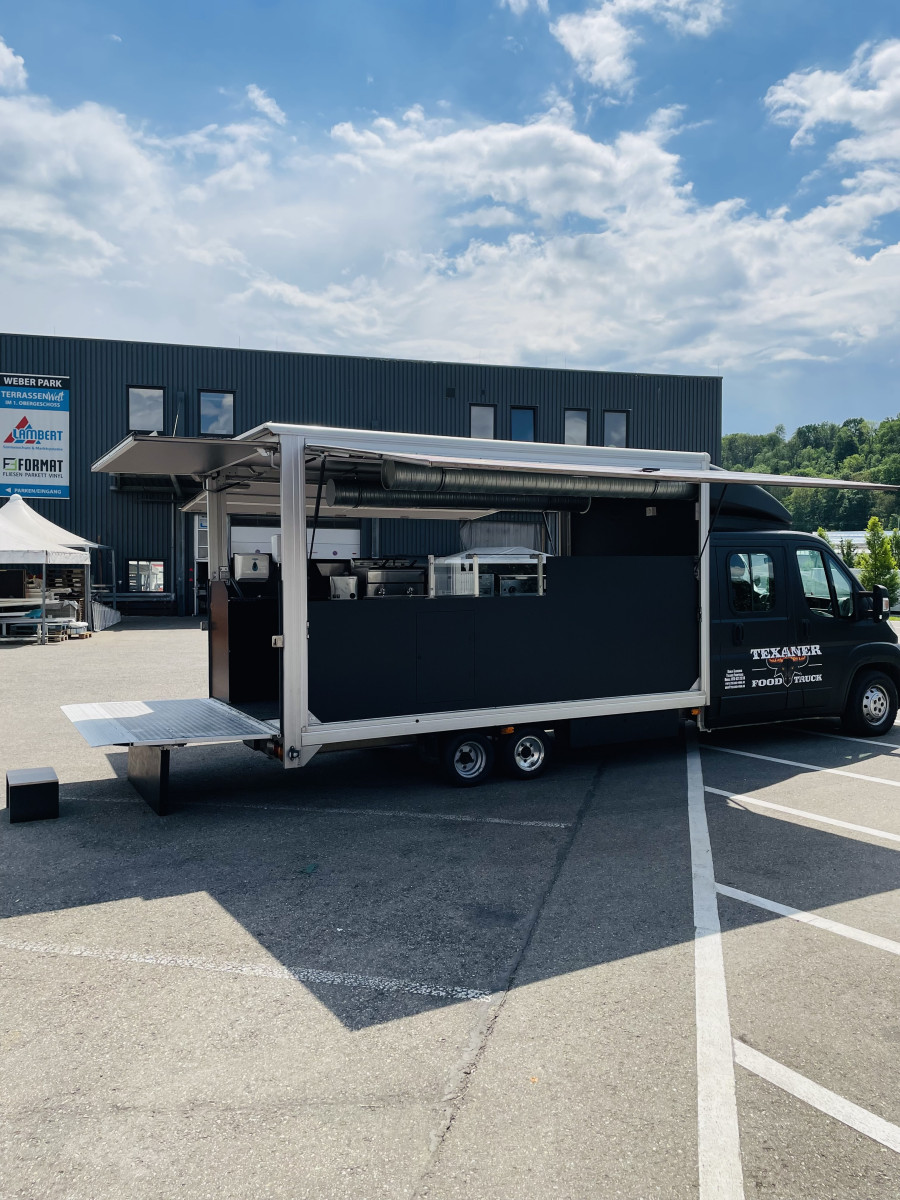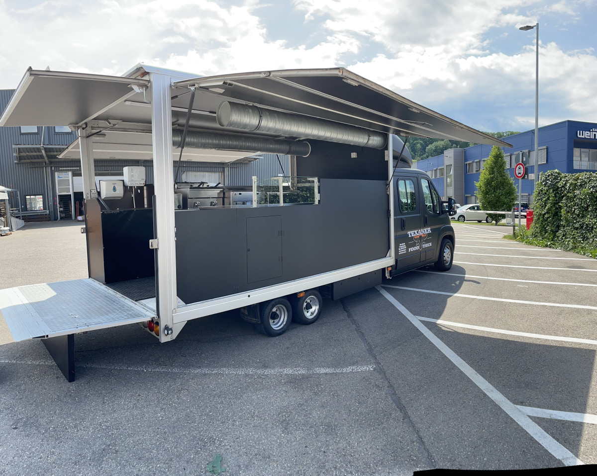 Ausstattung: - Rampe kann als Auffahrrampe oder als Verkaufsboden verwendet werden, - Verkaufsaufbau verfügt über 2 Verkaufsklappen, - Decke im Verkaufsaufbau mit schwarzen Alu-Verbundsplatten belegt, - Fußboden mit Anti-Rutsch-Gummimatte, - Stromanschluss, inkl. vielen Steckdosen und Lichtschalter, - Gaskasten mit Hochwertigen Gasleitungen, - Gasprüfbuch, - Dunstabzugszierrohr mit Motor an der Rückwand, - Zierrohr über der Ausgabetheke mit Einbaustrahlern, - Hygieneeinheit an der Rückwand, - Elektr. Friteuse 8 x 8 - 6,5kW, - Elektr. Pommeswärmer, - 2 Stück Gas Grillplatte- Glatt, - 2 Stück Kühltische mit Schubladen, Fahrzeug ist Außen foliert mit "Texanerr Foodruck", die Werbung ist noch für die nächsten 10 Jahre patentiert und ist im Preis imbegriffen.