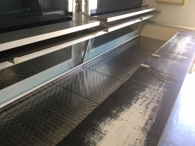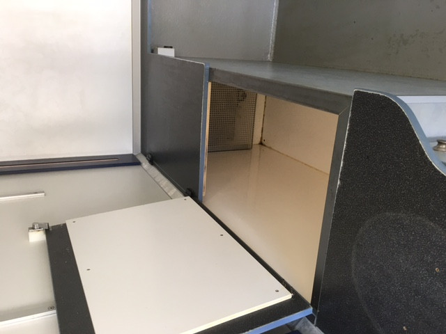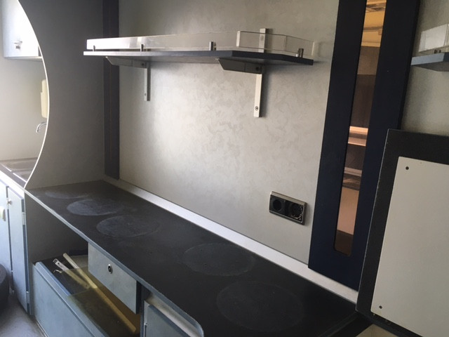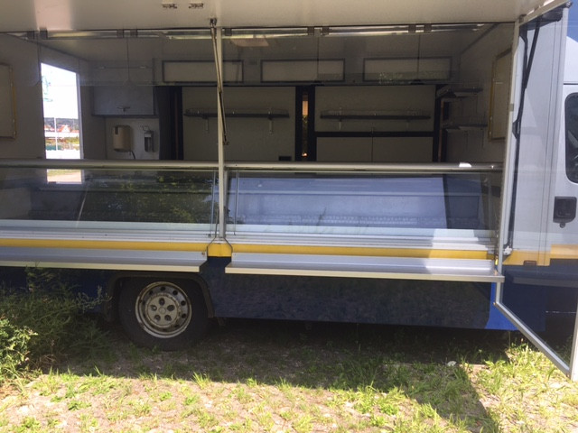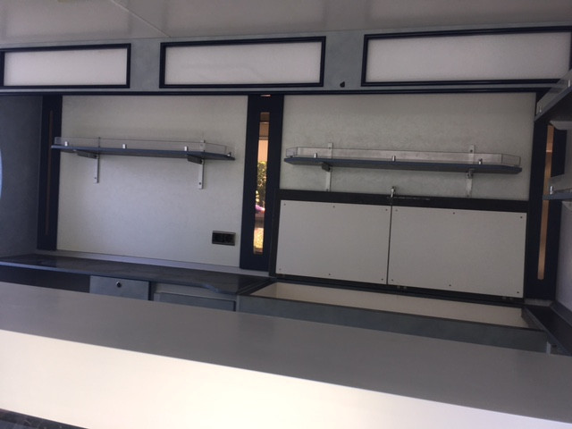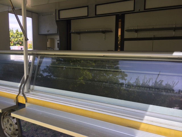 Ausstattung: - Strom und Licht - Kühltheke gesamte Länge - Kühlraum an der Rückwand - Regale an der Rückwand - Schränke an der Rückwand - Hygieneeinheit an der Rückwand - Blende an der Decke über der Kühltheke - Werbeblenden an der Decke über Rückwandtheke - Aufklappbarer Taschenablage - Aufklappbare Windschutz links + Rechts an der Verkaufsklappe