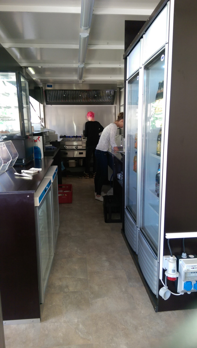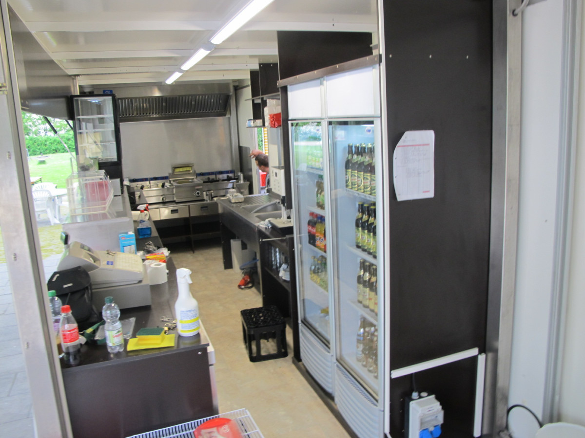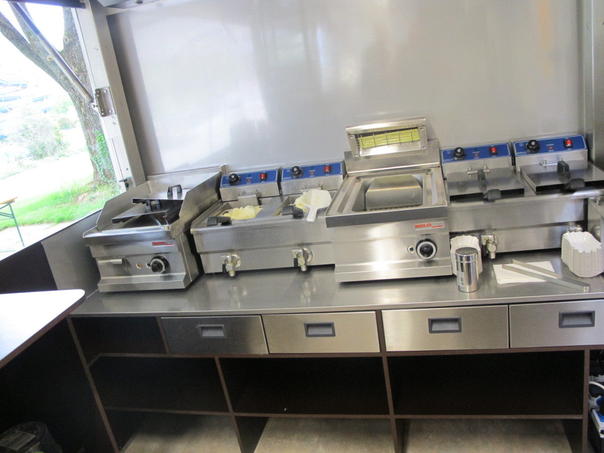 Ausstattung: - Strom 400 Volt, 16A und Licht - Blende am Dachrahmen über der Theke aus Holz - Arbeitstheke Heck-Rückwand mit GN-Schubladen - Hygieneeinheit mit Warmwasser und Doppeltwaschbecken - Abzugshaube 180cm mit Motor über der Arbeitsheke Heckseitig - 2 Stück Flaschenkühlschränke - 2 Stück Unterbau Umluft Gewerbekühlschränke - 2 Stück Doppel Fritteusen 2 x 11 Liter (2 x 3KW) - 1 Stück Pommeswärmer - Plattengrill