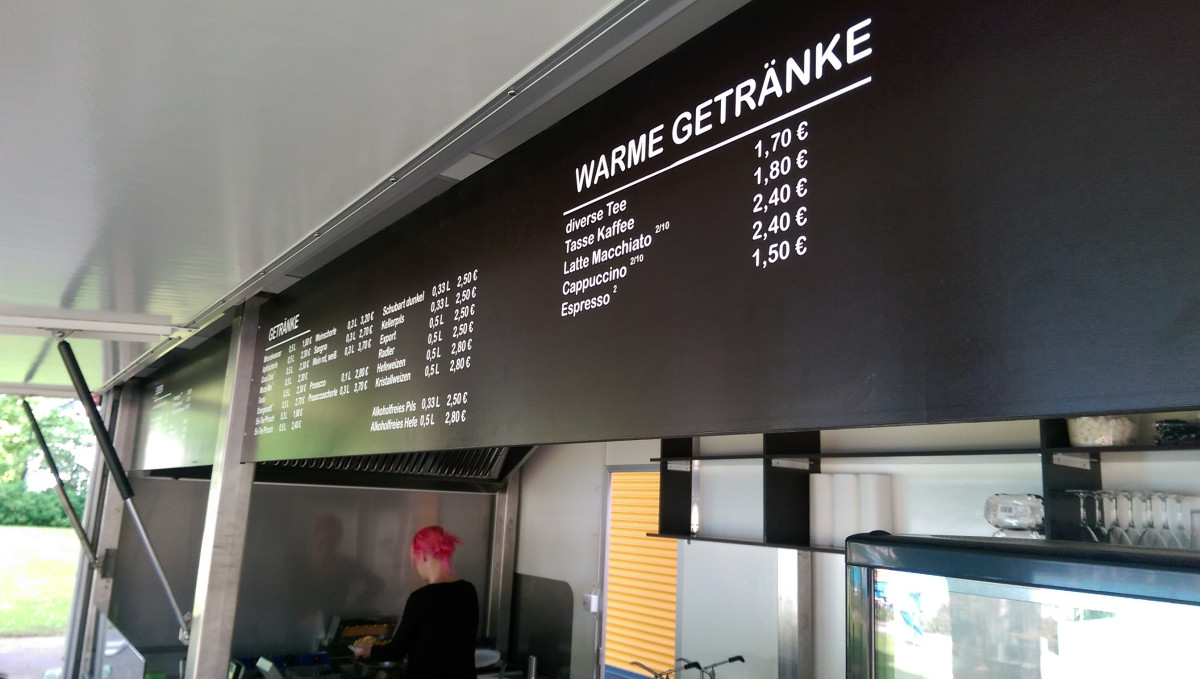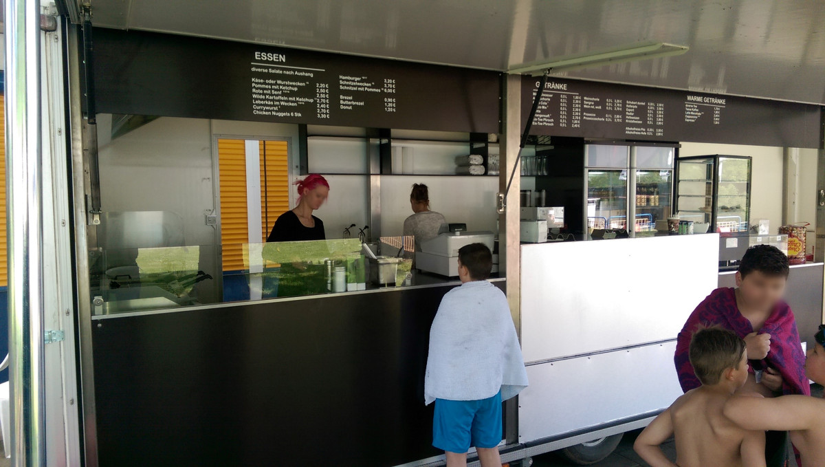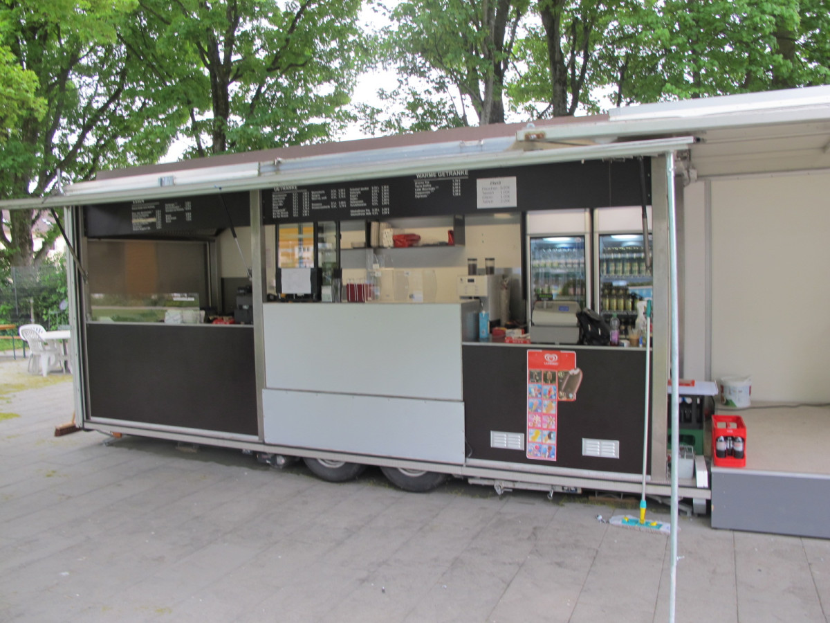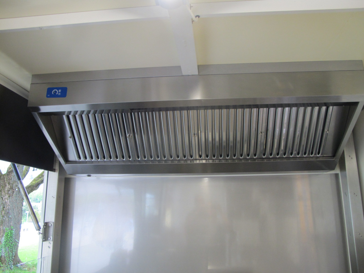 Ausstattung: - Strom 400 Volt, 16A und Licht - Blende am Dachrahmen über der Theke aus Holz - Arbeitstheke Heck-Rückwand mit GN-Schubladen - Hygieneeinheit mit Warmwasser und Doppeltwaschbecken - Abzugshaube 180cm mit Motor über der Arbeitsheke Heckseitig - 2 Stück Flaschenkühlschränke - 2 Stück Unterbau Umluft Gewerbekühlschränke - 2 Stück Doppel Fritteusen 2 x 11 Liter (2 x 3KW) - 1 Stück Pommeswärmer - Plattengrill