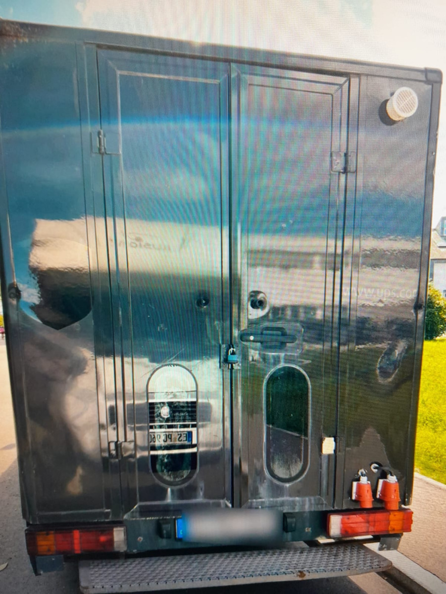 Kofferaufbau mit einer großen Verkaufsklappe und in Fahrtrichtung rechts eine seitliche Eingangstüre in Verkaufsaufbau.