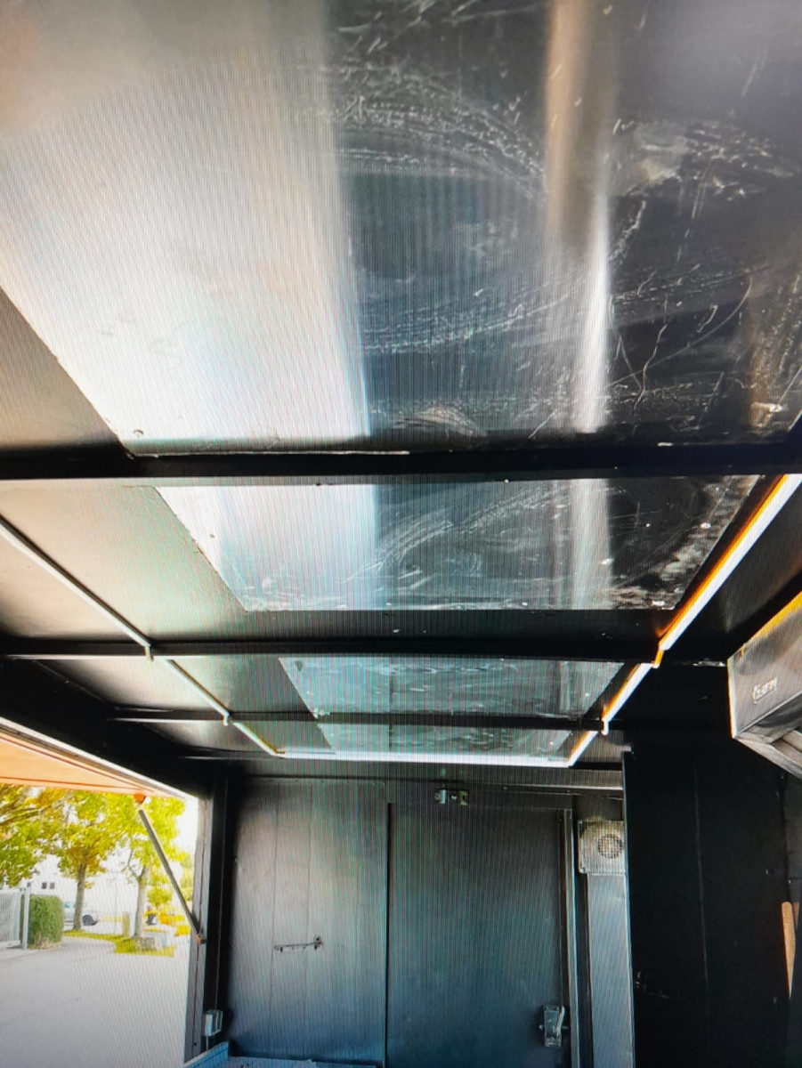 Ausstattung: Ausstattung: - Edelstahl-Abzugshaube über der Kochzeile - Leistungsstarke Grillplatte/Plancha - Fritteuseneinheit (mehrere Becken) - idealfür Burger, Pommes - Edelstahl-Arbeitsflächen -Theke auf der Kundenseite - Rutschhemmender Boden im Arbeitsbereich - lnnenraum komplett verkleidet, gut zu reinigen - Kleine Spüle - Elektro-Verteilerkasten im Aufbau