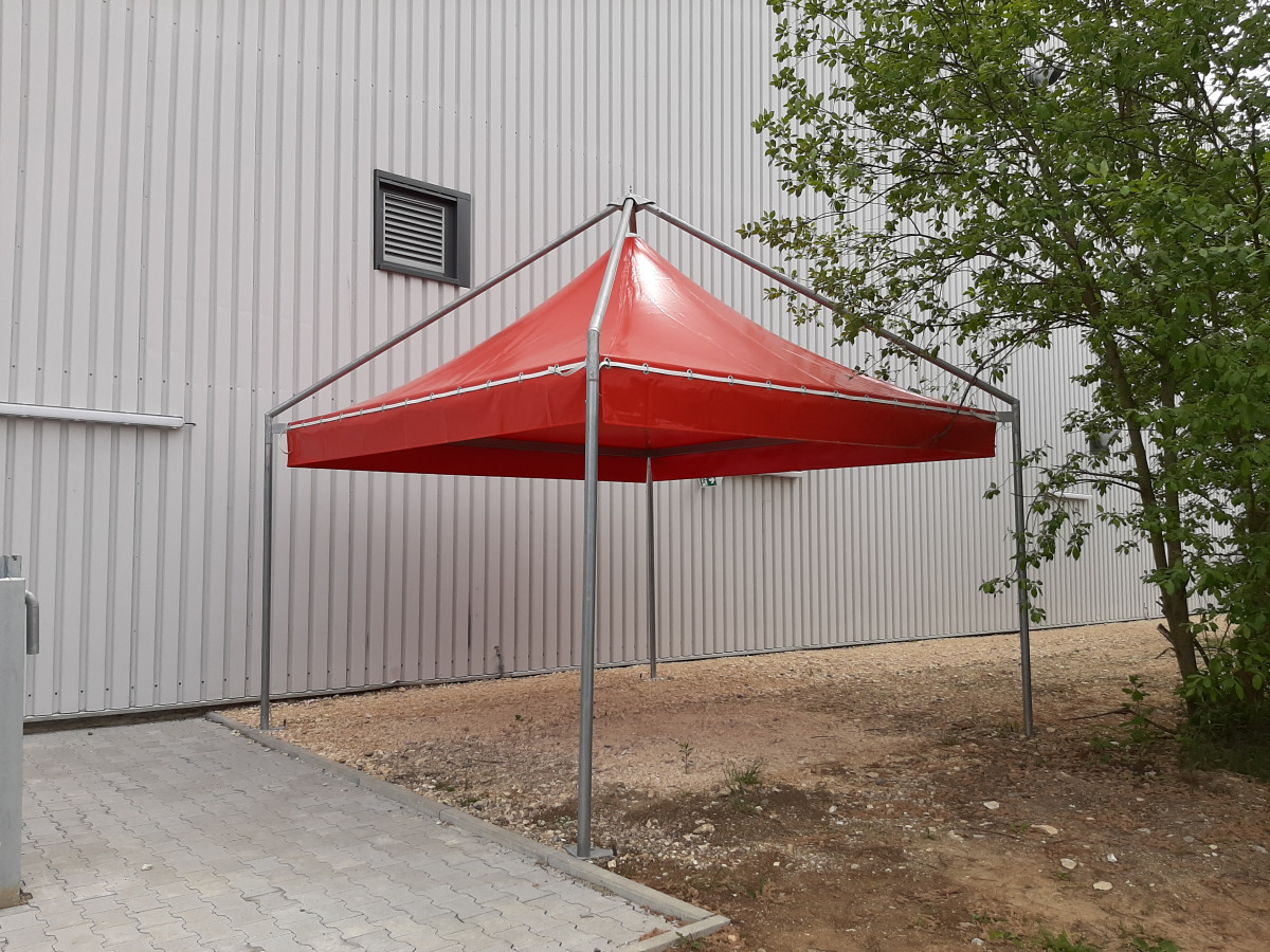 Ausstattung: Gestell Stahl feuerverzinkt, Plane PVC schwer entflammbar B1 in rot RAL 3000, inklusive 3 feste Einplanungen. Lichte Höhe 220 cm.