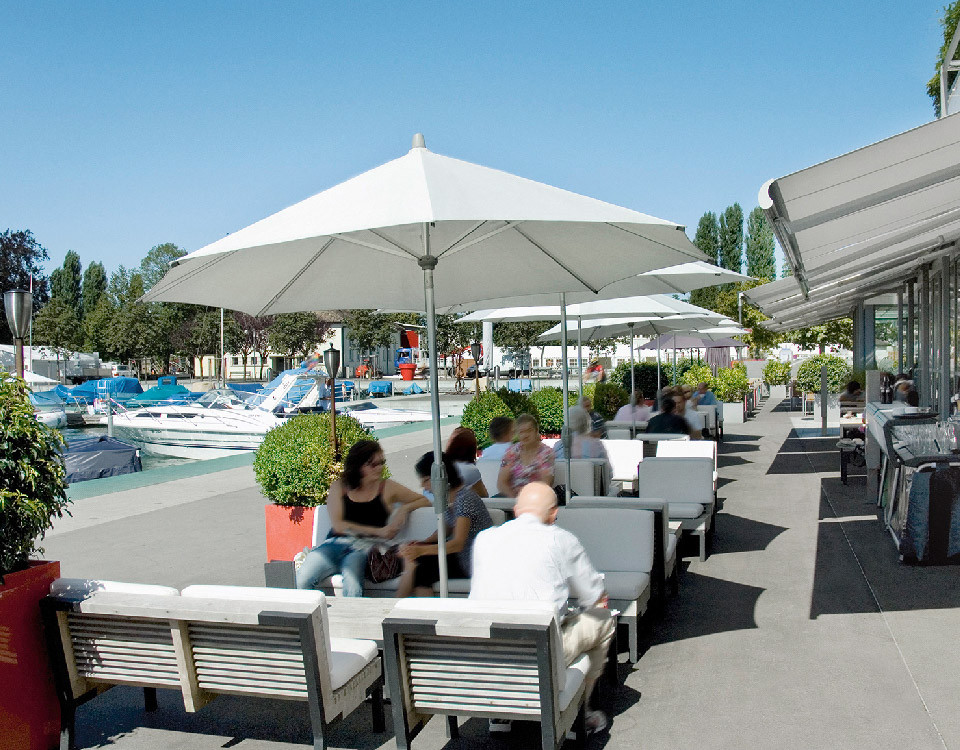 Ausbau: Das Schirmdach ist in den Formen rund, quadratisch und eckig verfügbar. Glatz bietet für die Auswahl beim Alu Twist die Wahl zwischen über 70 Stofffarben.