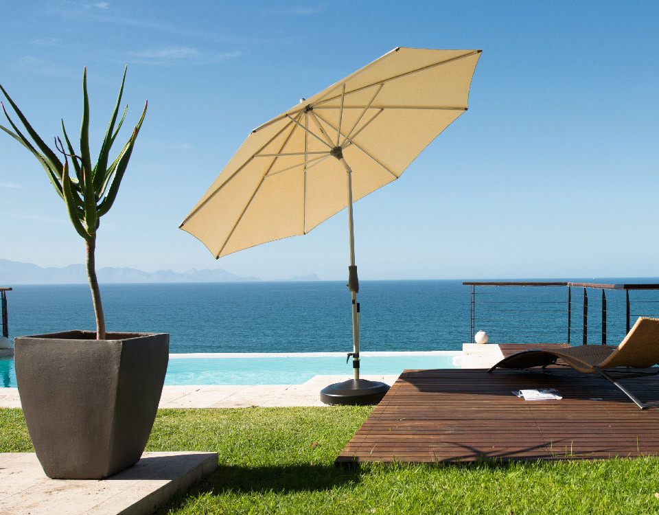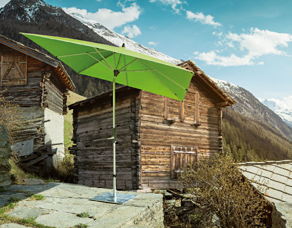 Ein Mittelmastschirm, der Ästhetik und Komfort in einem verbindet. Besonders wurde bei ihm auf eine leichte und angenehme Handhabung geachtet. Dafür besitzt er ein Kurbelgehäuse als auch ein Kippgelenk, um den Schirm ohne Stufen in Schräglage zu setzen. Diese Eigenschaft sorgt dafür, dass er sich perfekt für verwinkelte Außenbereiche oder Terrassen eignet. Jedoch ist das nicht das Einzige, das ihn auszeichnet. Er besitzt außerdem eine Kurbel im Mast mit dem der Schirm in Windeseile geöffnet und geschlossen werden kann. Für eine lange Lebenszeit des Schirms hat Glatz besonders auf beständige Materialien geachtet, deshalb sind das Gestell und die Streben aus korrosionsfreiem, natureloxiertem Aluminium. Durch die edle Verarbeitung besitzt er abgesehen von seiner langen Lebenszeit zudem einen hohen UV-Schutz.