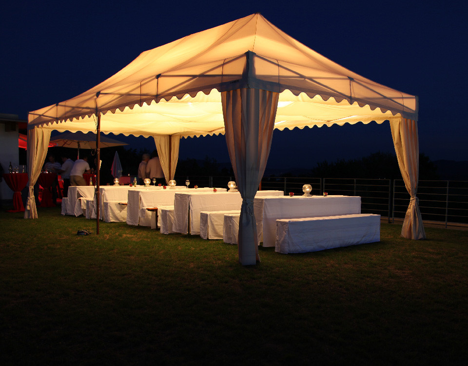 Material und Technik: Das Gestell ist aus Aluminium und in verschiedenen Farben erhältlich. Das Dach und die Seitenwände sind aus schwer entflammbarem Polyester nach DIN-Norm B1 gefertigt.