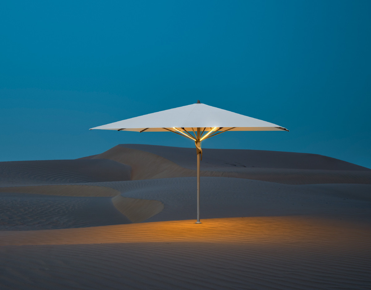 Tagsüber überzeugt er als Sonnenschirm und nachts sorgt er für Licht und eine angenehme Atmosphäre. Dank der in den Streben integrierten LED-Streifen verbreitet er selbst nach dem Sonnenuntergang warmweißes Licht. Dies macht ihn zum Mittelpunkt ihrer abendlichen Verabredungen.