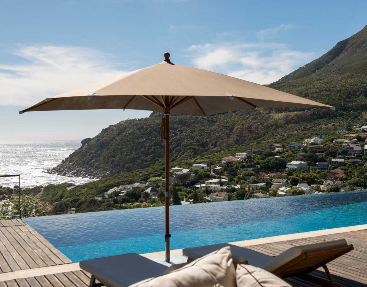 Der Mast des Schirms ist aus hochwertigem Platanenholz und wurde zum leichten Öffnen und Schließen mit einem Flaschenzug versehen.