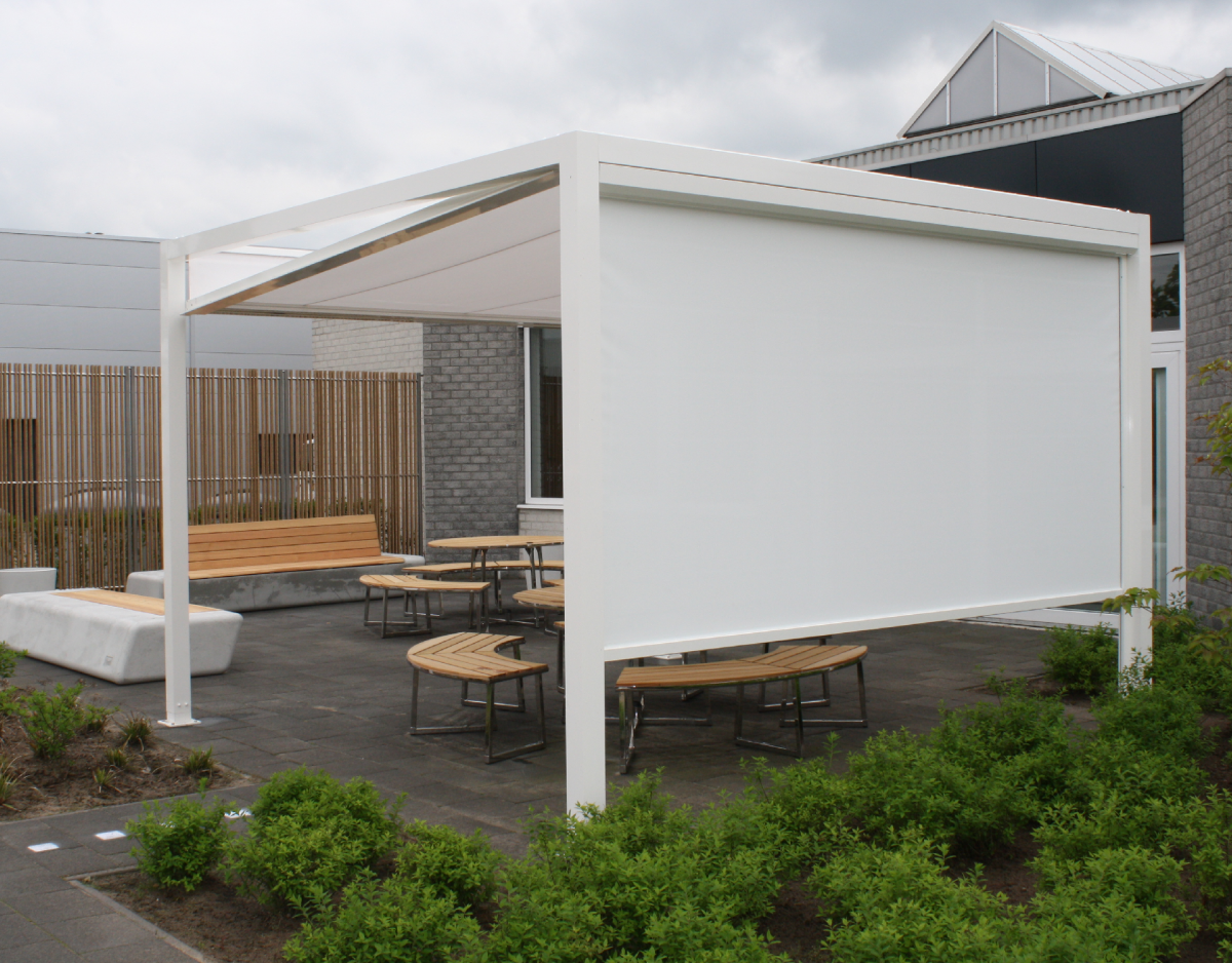 Darüber hinaus zeichnet es sich durch seinen einzigartigen, patentierten Absenkmechanismus aus. Er bietet sowohl Windschutz als auch Sonnenschutz oder Sichtschutz. Denn wie ein Würfel kann er an allen Seiten flexibel auch an den Seiten eine Horizontalmarkise sein. Damit eignet er sich perfekt als eine Art textiler Wintergarten.